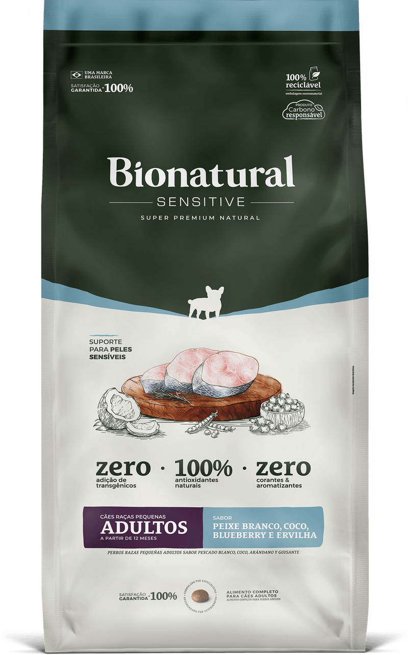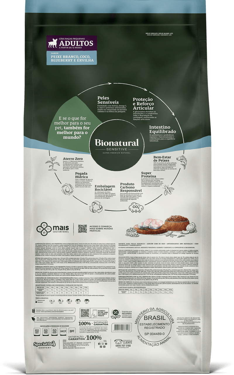 Farinha de tilápia (peixe branco), farinha de ervilha (mín. 5%), farinha de insetos (mosca soldado negra mín.5%), proteína isolada de soja (não transgênica), proteína concentrada de soja (não transgênica), quirera de arroz , sorgo integral moído, biomassa de microalgas (Schizochytrium sp.), óleo de aves, blueberry (mirtilo mín. 0,015%), coco em flocos (mín. 0,015%), maçã, fibra de cana-de-açúcar, polpa de beterraba, levedura de cervejaria inativada desidratada, extrato de Yucca , aditivo prebiótico (parede celular de levedura – 0,006%), aditivos probióticos (Bifidobacterium lactis e Lacticaseibacillus rhamnosus) , hidrolisado de carne de aves e fígado de aves, sulfato de condroitina (0,03%), sulfato de glicosamina (0,05%), aditivo regulador de acidez, concentrado de tocoferóis, extrato de alecrim, extrato de chá verde (Camellia sinenses ), extrato de menta, hortelã (Mentha spp.), DL-metionina, cloreto de sódio, carbonato de cálcio, fosfato bicálcico, cloreto de potássio, vitamina A, vitamina D3, vitamina E, vitamina K3, vitamina B1, vitamina B2, vitamina B6, vitamina B12, vitamina C, niacina, cloreto de colina, ácido pantotênico, ácido fólico, biotina, iodato de cálcio, proteinato de cobre, proteinato de ferro, proteinato de manganês, proteinato de zinco, levedura enriquecida com selênio, ácido propiônico, sorbato de potássio, parede celular de levedura.