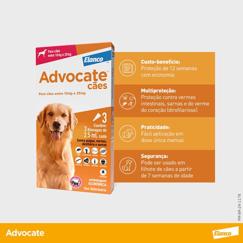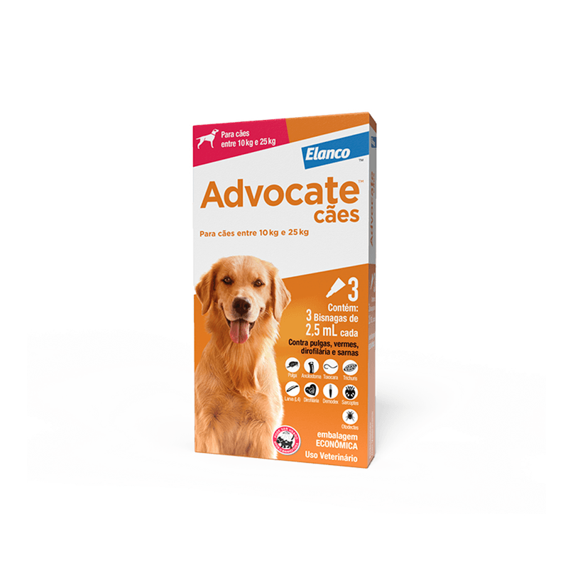 Vermes: Advocate trata e previne os vermes intestinais mais comuns em cães e gatos. Eles são chamados de nematóides ou vermes redondos. Uma única dose de Advocate Cães elimina os vermes adultos no intestino e os estágios jovens dos vermes, que podem migrar para outros órgãos. O uso mensal de Advocate previne contra reinfestações, pois o produto mantém-se ativo por 30 dias.