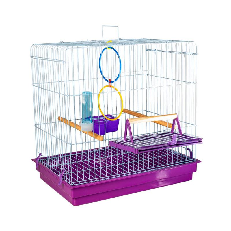 Armação, 1 tratador, 1 bebedouro, brinquedo (argolas), 2 poleiros internos grandes, 1 poleiro externo pequeno, 1 bandeja grande, 1 grade aramada que separa a ave dos dejetos, 2 suportes para poleiros e 1 bandeja grande.