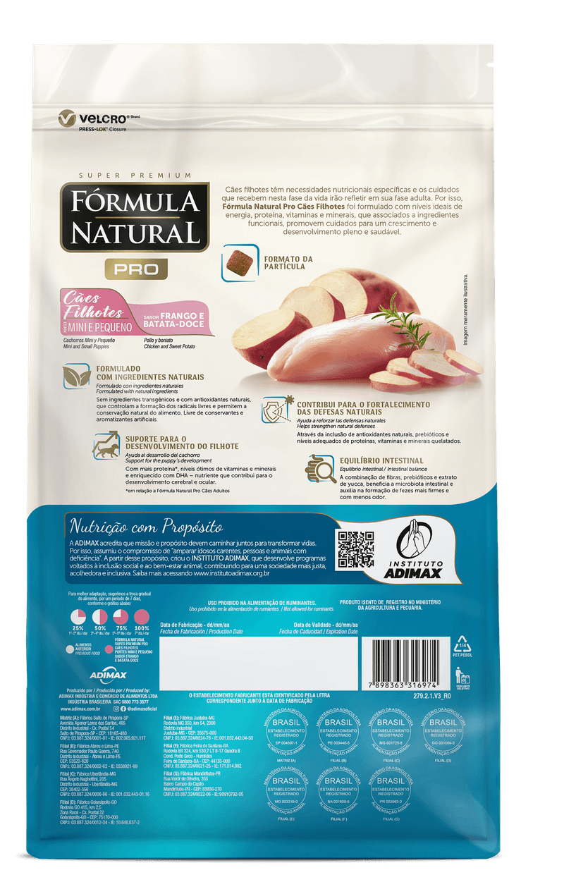 Cães filhotes têm necessidades nutricionais específicas e os cuidados que recebem nesta fase da vida irão refletir em sua fase adulta. Por isso, Fórmula Natural Pro Cães Filhotes foi formulado com níveis ideais de energia, proteína, vitaminas e minerais, que associados a ingredientes funcionais, promovem cuidados para um crescimento e desenvolvimento pleno e saudável.