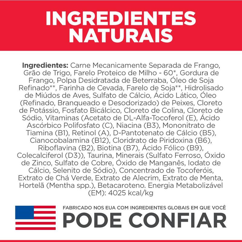 Farinha de Vísceras de Aves, Milho Integral Moído*, Farelo de Glúten de Milho-60*, Quirera de Arroz, Gordura de Frango, Vitaminas (A, C, D3, E, Tiamina (B1), Riboflavina (B2), Niacina (B3), Pantotenato de Cálcio (B5), Cloridrato de Piridoxina (B6), Biotina (B7), Ácido Fólico (B9), Cobalamina (B12), Cloreto de Colina), Betacaroteno, Cloreto de Potássio, Sulfato de Cálcio, Cloreto de Sódio (Sal Comum), Carbonato de Cálcio, Minerais (Sulfato Ferroso, Óxido de Zinco, Sulfato de Cobre, Óxido de Manganês, Iodato de Cálcio, Selenito de Sódio), DL-Metionina, Taurina, L-Lisina, L-Triptofano, Aditivo Palatabilizante a Base de Fígado Suíno, Antioxidantes (BHA & BHT). Espécies doadoras do gene: Agrobacterium tumefaciens (*), Bacillus thuringiensis (*), Streptomyces viridochromogenes (*), Zea mays (*).