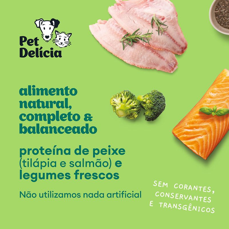 A Pet Delícia é 0% conservantes, corantes, sabores artificiais e também é 0% transgênica. É uma ótima opção que oferece mais variedade na hora da refeição do seu pet além de ser um alimento natural. Rica em ômegas 3, 6 e 9 para uma pele saudável e pelos com brilho. Com fibras, prebióticos e beta-glucanos, além disso possui antioxidantes e anti-inflamatórios naturais.