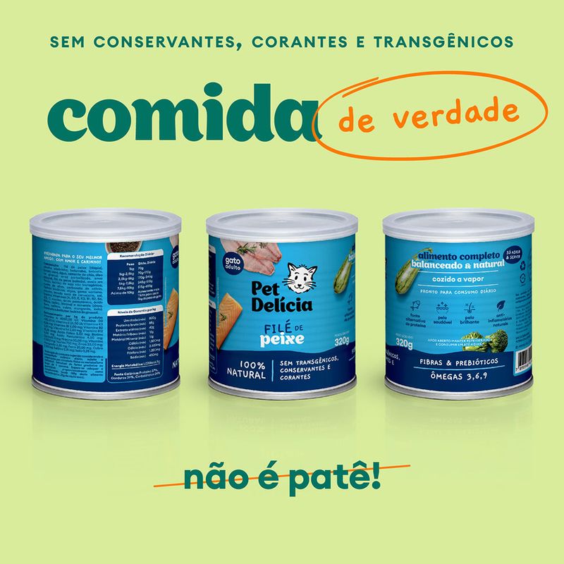 A Ração Úmida Para Gatos Pet Delícia Filé de Peixe é uma deliciosa receita 100% natural feita com filé de tilápia e salmão fresco criando um sabor e cheiro irresistível para os gatinhos. A receita oferece umidade ideal, gorduras saudáveis inclusive ômegas 3 e 6, fibras e prebióticos que melhoram o sistema digestivo do gato. Cheirosas e saborosa, indicada para gatos exigentes.