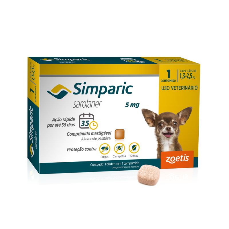 O Simparic é um comprimido mastigável altamente palatável indicado para cães adultos e filhotes. Ele oferece proteção contra pulgas, carrapatos e sarnas por pelo menos 5 semanas após a ingestão.